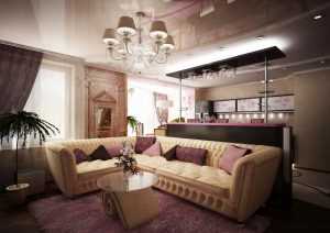 Для визуального разделения часто используют многоуровневые потолки. Их оборудуют большим количеством ламп, которые регулируются. Чтобы увеличить объем комнаты, можно установить глянцевый потолок. Он скроет снижение его уровня.