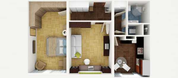 Данный вариант планировки квартиры предполагает наличие двух комнат, которые изолированы друг от друга. Они обладают небольшой площадью, но удобны и комфортны. Распределение данного пространства может проходить несколькими вариантами.