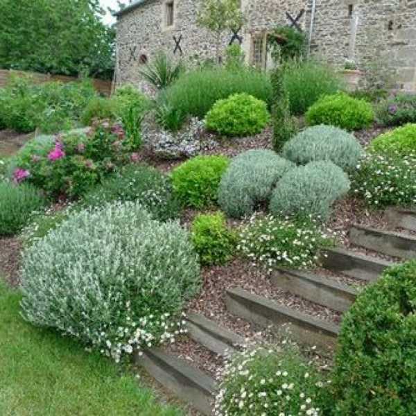 Если вы хотите визуально сгладить перепад высот, то в нижней точке высаживаются самые высокие растения, а ближе к верху — низкорослые.