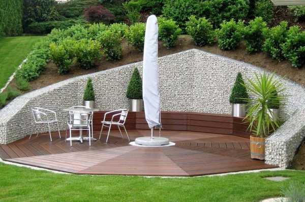 Набирают популярности в ландшафтном строительстве габионы. Это сетчатые каркасы из металлической проволоки, заполненные природным камнем. Они практичны, удобны в использовании, долговечны, декоративны. Из них легко создавать подпорные стенки любой конфигурации. Изготовление таких блоков не составляет большой сложности. Иногда внутри сетки камни смешивают с почвой, а затем закладывают туда семена декоративных растений. В габионах можно использовать любой камень или даже какой-то другой материал. Кроме того, они легко интегрируются в практически любой ландшафтный дизайн участка с уклоном.