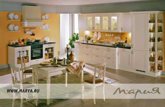 На фото — кухонный гарнитур компании «Мария» в интерьере загородного дома.Сегодня отзывы свидетельствуют о том, что предприятие выпускает более 50-ти разновидностей комплектов в разных стилях, но основными для дизайнеров компании являются стили классика и модерн.