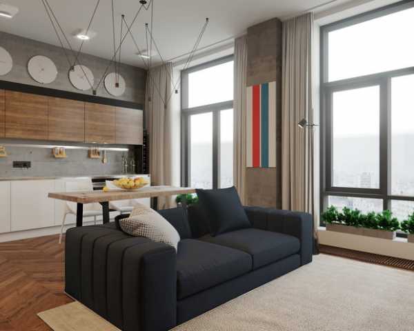 После зонирования и измерения отдельных «мест» — для приготовления еды и для отдыха, время выбирать мебель. Из необходимого минимума — обеденная группа, диван, возможно журнальный столик. Кухонный гарнитур должен быть как минимум с 2-3 напольными тумбами и навесными шкафчиками.
