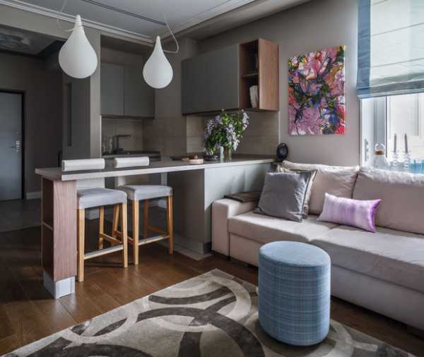 Интерьер объединённого пространства также делится на две зоны, но они не должны сильно отличаться. Идея разнопланового подхода – не самая лучшая. Для гармонии выход один – плавный переход без ярких отличий. Хотя встречаются и такие заказчики, которые требуют кардинального отличия кухни от гостиной. В квартире-студии это не всегда приемлемо, даже если кухня в ней имеет площадь 14 м².