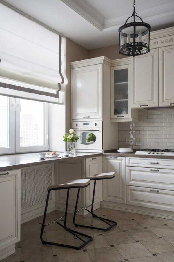 - Подоконник, плавно переходящий в обеденный стол – прерогатива маленьких кухонь, но в помещении 14 м² такое расположение может иметь место.
