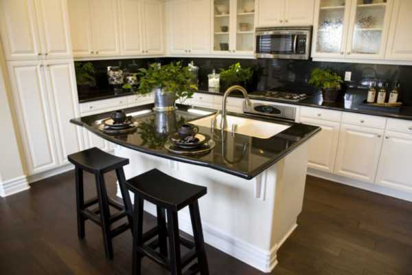 Но в нём можно поиграть и тёмными расцветками, расставляя акценты не в центре помещения, а по краям, тем самым подчёркивая концепцию дизайна комнаты. Размещать при этом мебель придётся с учётом цветового тона. Поэтому особое внимание нужно уделить и цветовому оформлению кухонного гарнитура. В этом случае можно поступить так: