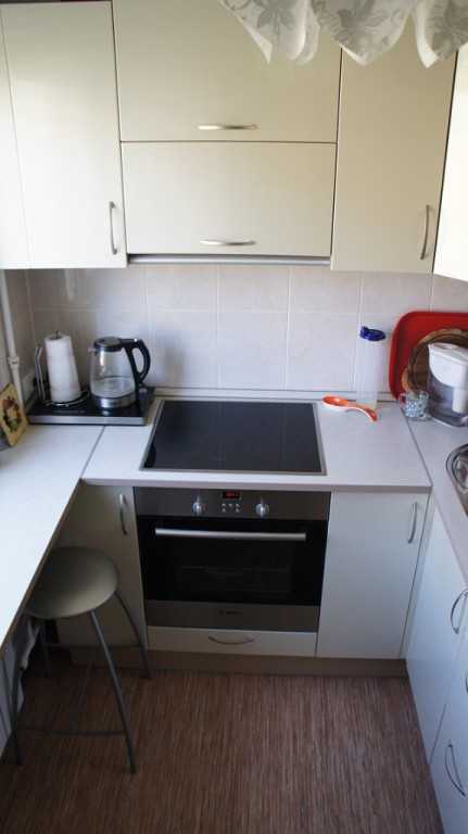 - Варочная поверхность с минимальным количеством конфорок (обычно хватает 2-3), а также духовой шкаф небольшой высоты, чтобы в тумбе осталось достаточно свободного места для какого-нибудь ящичка.