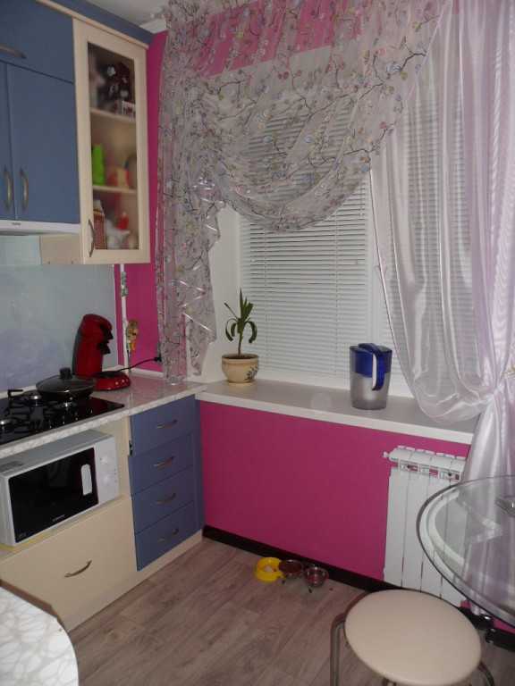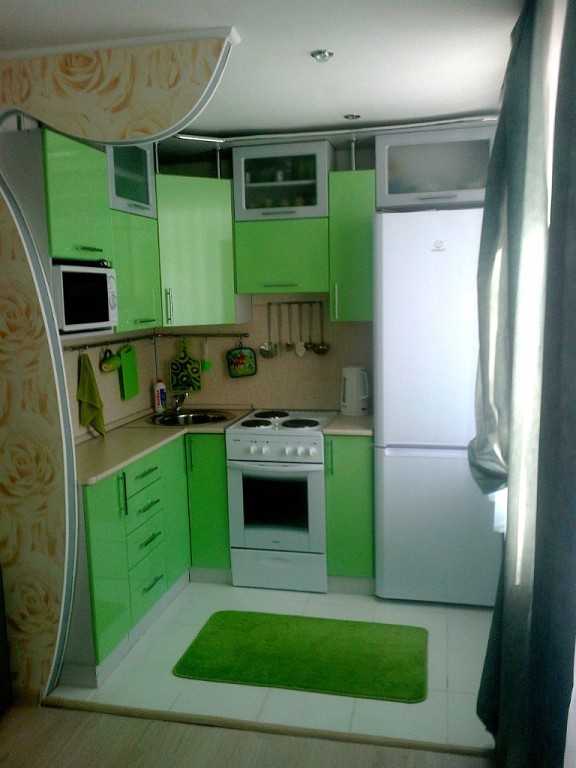 При такой планировке предпочтительнее повесить шторы с крупным рисунком. Следует продумать дополнительное освещение. Обычно оно устанавливается на фартук. Двери выбираются раздвижного типа, чтобы сэкономить место.
