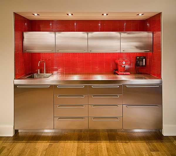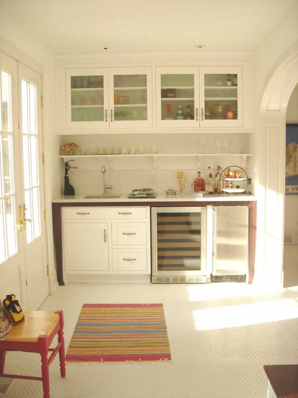 Кухни-моноблоки изначально создавались как вариант для офисов, а также домов, где хозяева проводят немного времени за готовкой, просто разогревая полуфабрикаты. Поэтому в некоторых дизайнерских моделях можно встретить встроенные мини-бары и даже винные холодильники.