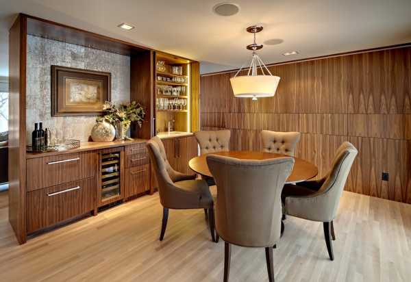 Сама по себе барная стойка может быть достаточно узкой: только чтобы на нее помещалась тарелка. Это позволит сэкономить свободное место. А дополнительные верхние крепления можно использовать для хранения чашек, бокалов и прочей посуды.