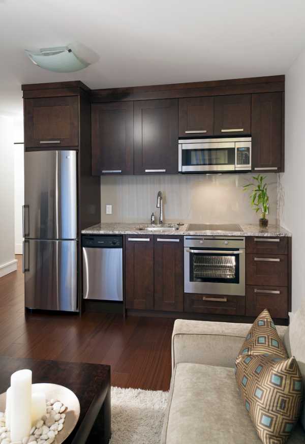 При создании дизайна собственной мини кухни фото готовых комплектов помогут подобрать оптимальный вариант размещения всех систем и оборудования. В точности повторять их не обязательно, но несколько интересных идей наверняка стоит реализовать.