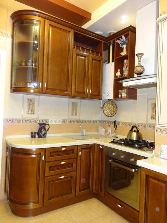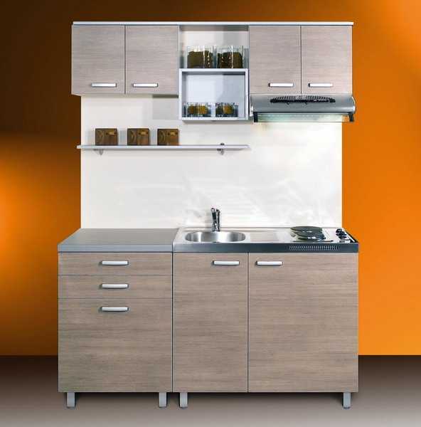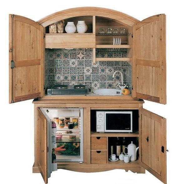 В продаже можно найти миниатюрные кухни-шкафы, даже в классическом стиле – выполненные в корпусе из массива дерева, с резьбой и прочими украшательствами. Некоторые идут с покрытием из натурального шпона – эти комплекты подешевле, хотя внешне мало отличимы от предыдущих. Но давайте смотреть правде в глаза: может быть, сама по себе такая миниатюрная кухня и выглядит оригинально, а в реальном интерьере кроха с претензией на добротность и роскошь классического стиля смотрится нелепо.