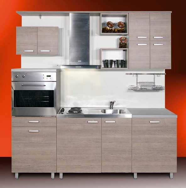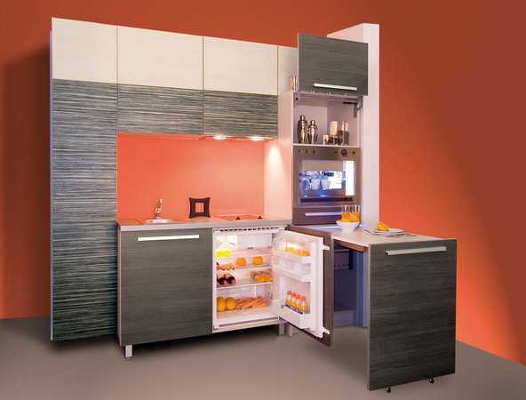 Миникухня от обычного комплекта может отличаться только одним – своими размерами. В остальном это должен быть такой же функциональный и удобный рабочий уголок. Количество встроенной бытовой техники во всех случаях остается примерно одинаковым, разница только в ее габаритах. Здесь должны уместиться: