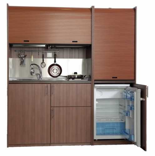Эти действительно чем-то напоминают большие шкафы. Если вы еще застали «бабушкины» трехстворчатые гиганты-гардеробы, можете попробовать представить, как в его недрах умещаются узкие тумбы, варочная поверхность, встроенный холодильничек и мойка. Такие конструкции обычно устанавливаются вдоль одной из стен на маленькой кухне, но могут быть и частью квартиры-студии.