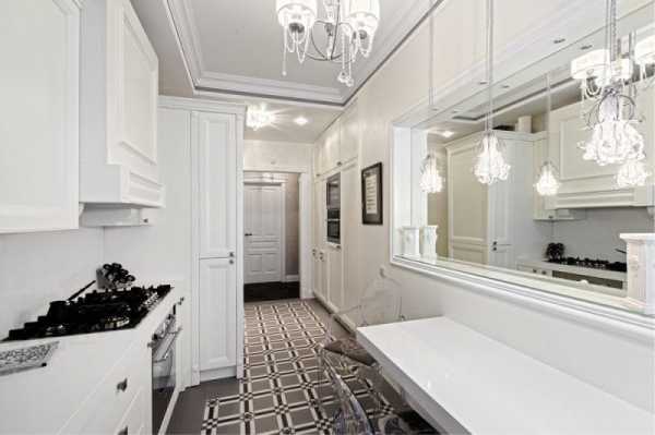 На кухне прямоугольной формы мебель располагается у стен. Обеденный стол заменяется на барную стойку. Чтобы визуально расширить стены можно отделать место фартука зеркальными элементами.