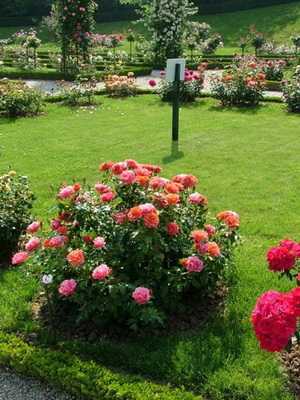 Как видно на фото, розарий на дачном участке может быть собран из цветов разных типов: например, из чайно-гибридных, миниатюрных и почвопокровных роз. Такой моноцветник будет «дизайнерским», потому что он представляет собой настоящую скульптурную группу с перепадом высот, выстроенными горизонталью и вертикалью, разницей форм и фактур. Такой розарий на участке можно разместить в парадной части сада.