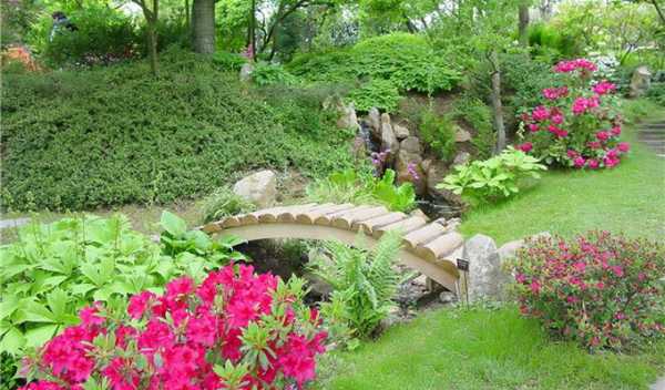 Над такими ручьями хорошо будут смотреться декоративные мостики. Ручьи и водопады из роз красивы в сочетании со скрытой подсветкой, а также с декоративными невысокими фонарями в форме шара или светящихся столбиков.