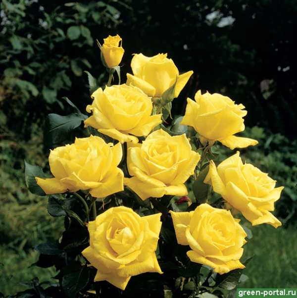 Еллоу Флеуретт. Роза высотой не больше 70 см. Эта роза считается одной из крепких с обильным цветением. Маленького размера жёлтые цветы собраны в соцветие, листы темного зеленого оттенка.