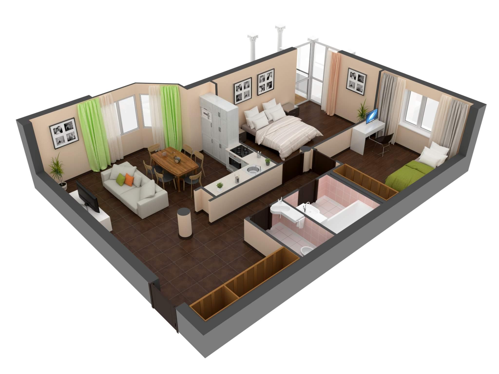 Трехмерный план квартиры отлично помогает продумать весь интерьер в квартире. Намного проще и удобнее создать 3D план комнаты, чем чертить его на бумаге или придумывать, находясь в пустой комнате.