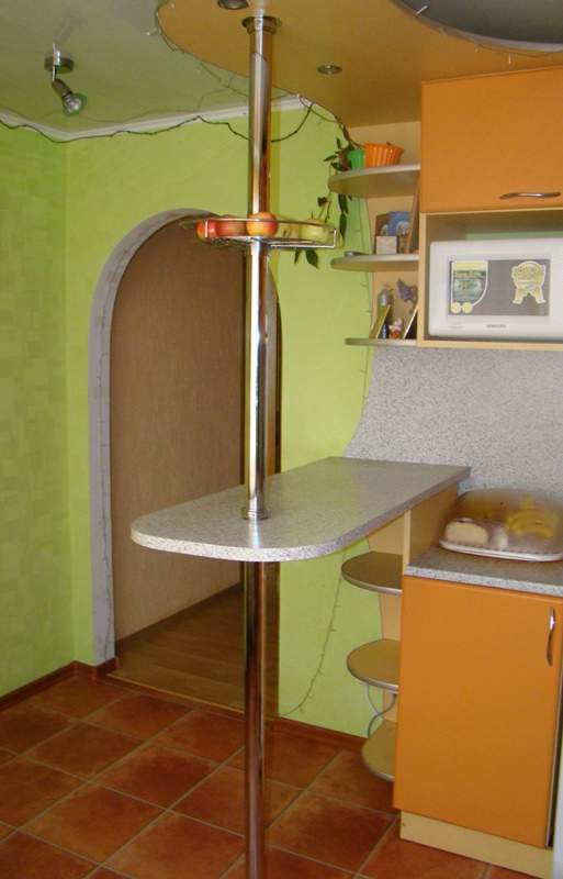 В большинстве случаев маленькая кухня с барной стойкой дизайн (фото) которой разрабатывают профессионалы, оснащается всевозможными аксессуарами, шкафчиками и различными элементами декора. Самостоятельно расставить и совместить всё необходимое в помещении с маленькой квадратурой практически не возможно. При этом необходимо подобрать правильное место для барной стойки, чтобы она служила удачным продолжением мебельного гарнитура, а не бросалась в глаза окружающим, вызывая всеобщее удивление и недоумение. Традиционная барная стойка представляет собой столешницу, определённого размера, которая устанавливается на небольшую опору (ножку). В качестве материала для столешницы может использоваться:
