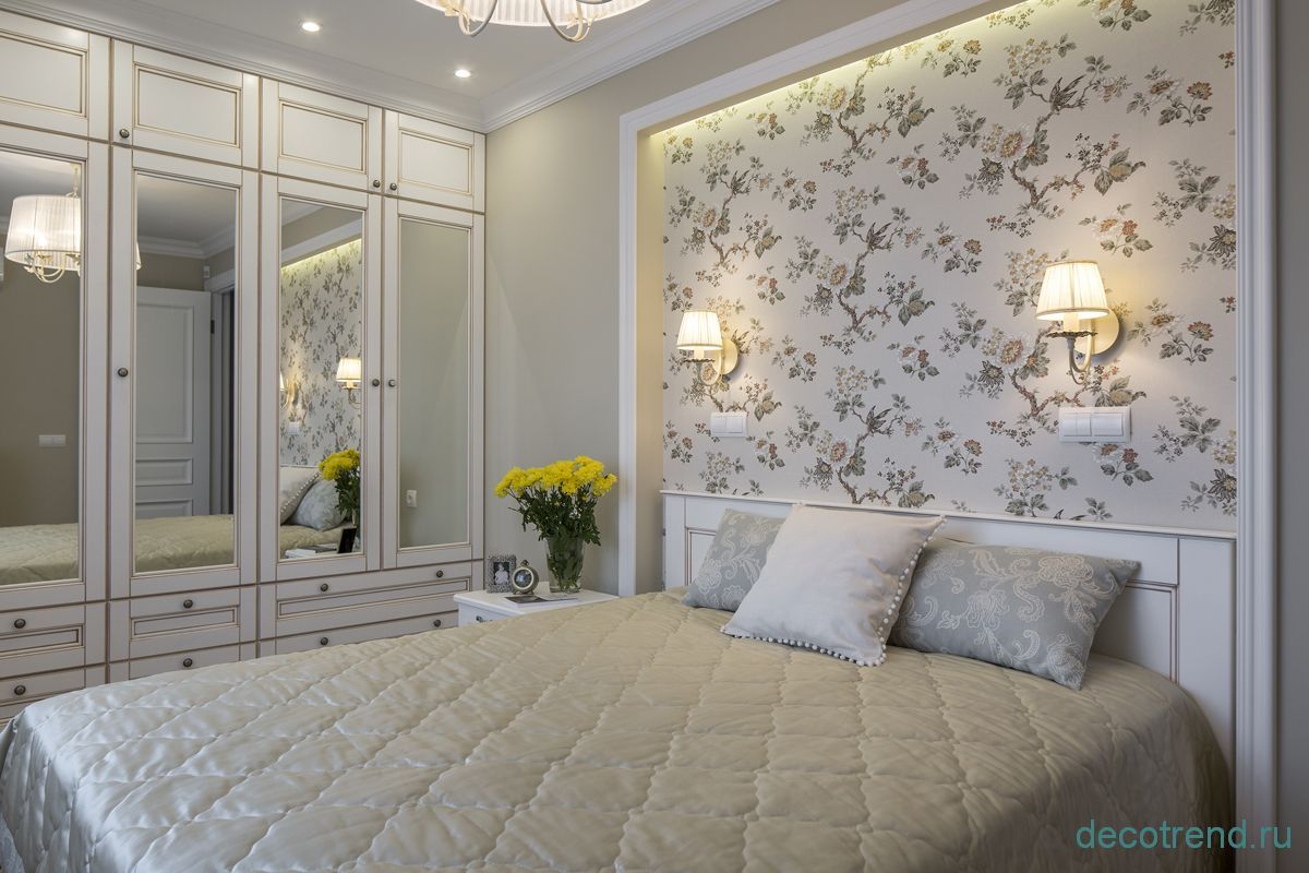 Классическая спальня с белыми стенами — отличный способ создать царскую почивальню с выразительным лоском. Как же сделать так, чтобы поверхности были вычурными и строгими одновременно? Для того, чтобы создать правильную «почву» для последующей расстановки мебели, дизайнеры используют такие материалы как венецианская штукатурка или тканевые обои из шелка. Чаще всего применяется несколько фактур одновременно, комбинируя их друг с другом и придавая этим помещению еще более экстравагантный вид. Отлично смотрятся живописные панно с птицами, картинами природы или античными статуями. Белые обои в спальне чаще всего имеют характерный классический орнамент, равномерно повторяющийся по всему полотну.