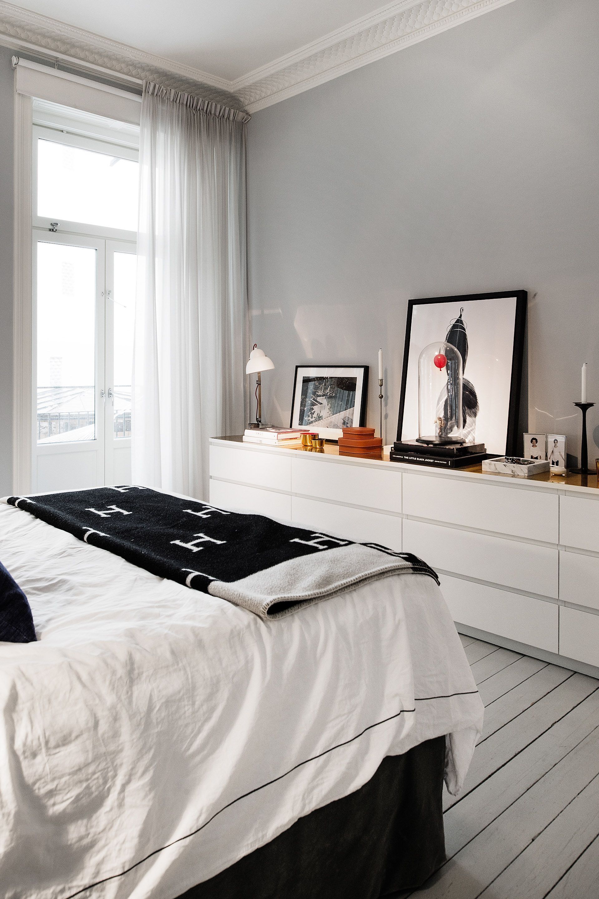 Интересный подход — сделать всю мебель и все стены в комнате белыми и использовать только черный цвет в качестве аксессуаров и акцентных элементов, таких как пуховое одеяло. , фурнитуру, акцентные подушки или произведения искусства в рамах. {найдено на лолалине}.
