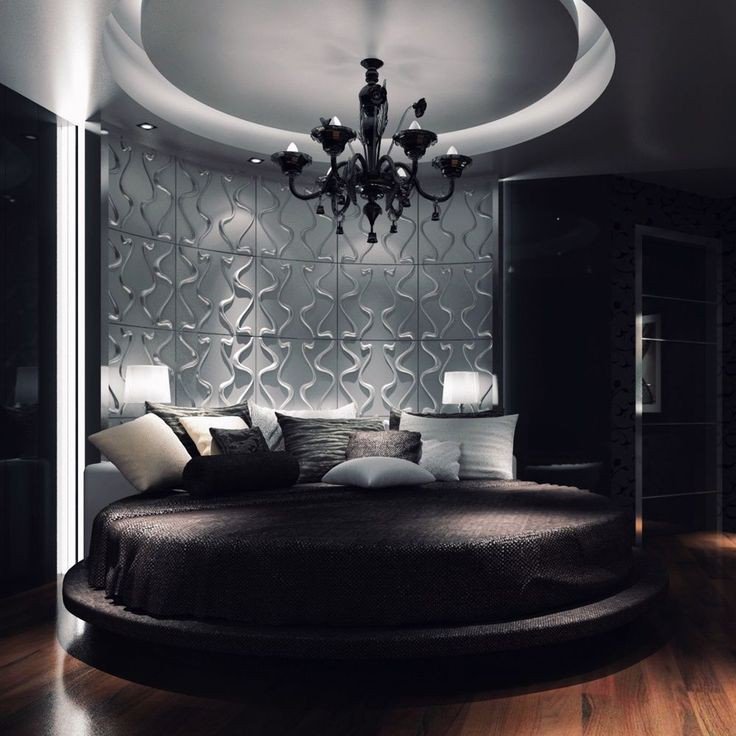 Если вы выберете черные шторы или оконные покрытия, тогда свет из окна будет выделяться и казаться намного ярче из-за сильного контраста. Продолжите декор сочетанием черного пола, который безупречно контрастирует с белой кроватью на платформе.Смягчите образ мягким изголовьем и декоративной люстрой.
