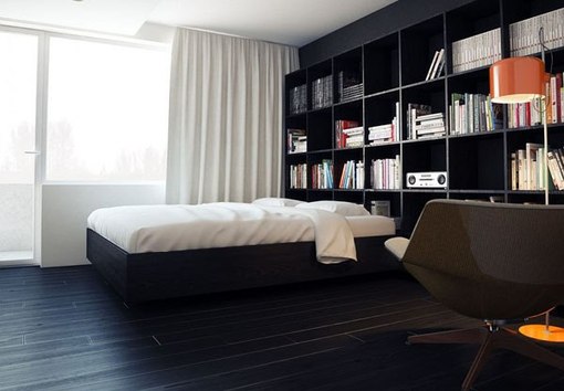 Действительно интересный подход — выбрать черный пол. В этой современной главной спальне есть блестящий пол и акценты, в которых естественным образом сочетаются два указанных выше цвета. Коврик и кресло имеют схожую тему.{найдено на edndesign}.