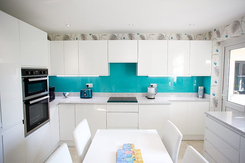 Кухня, выполненная в бело-бирюзовых тонах, является одной из самых распространенных и идеальных. Как правило, чаще всего оформляют верхние ящики гарнитура в белых тонах, а нижние – в различные оттенки бирюзы. Дополнением к такому гарнитуру является белая столешница, а вот фартук выступает акцентным элементом. Закаленное стекло может содержать коричневатые, золотистые или солнечные рисунки на белом фоне. Также такую деталь можно выполнить в виде мозаики или выложить керамической плиткой.