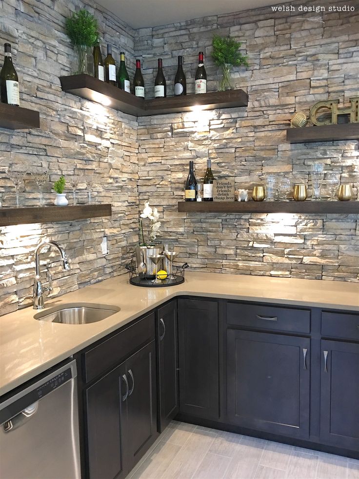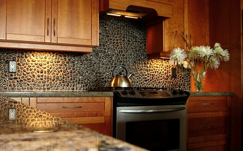 Декоративный камень может быть использован по всему периметру, включая зону фартука.