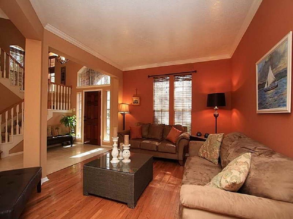Популярный, универсальный, практичный цвет, который можно применять для оформления любых гостиных. Комната получится теплой, гармоничной. Для декора применяются яркие, сочные тона, имитация кирпичной кладки, фактурная штукатурка.