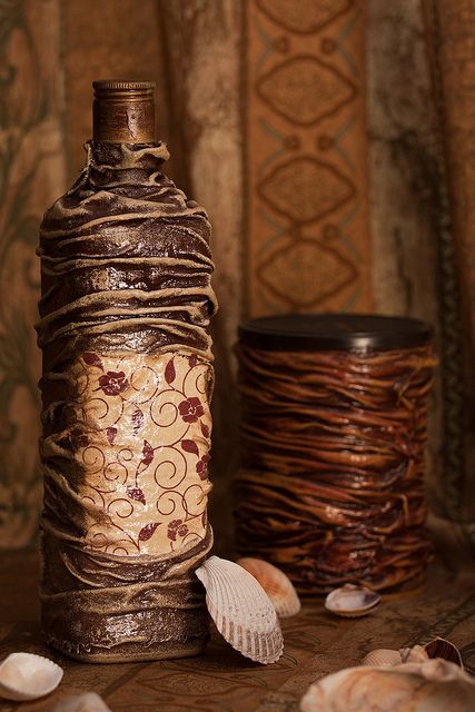 Декупаж бутылок с помощью туалетной бумаги дает возможность создавать привлекательные и необычные объемные элементы декора. Так, с помощью туалетной бумаги легко создать растительные украшения (цветы, листья, веточки, лианы), выпуклый геометрический орнамент и другие декоративные элементы простых форм.