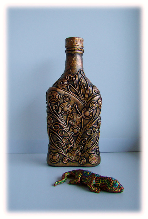 - Таким способом декорируем всю бутылку, оставляя концы полоски на декор дна.