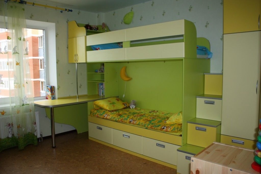 В случае разновозрастных детей, двухъярусные кровати, также являются достаточно оптимальным решением. Как правило, верхний уровень, отдается старшему ребенку, а нижний оборудуют кроваткой для младшего или манежем или люлькой для новорожденного малыша.