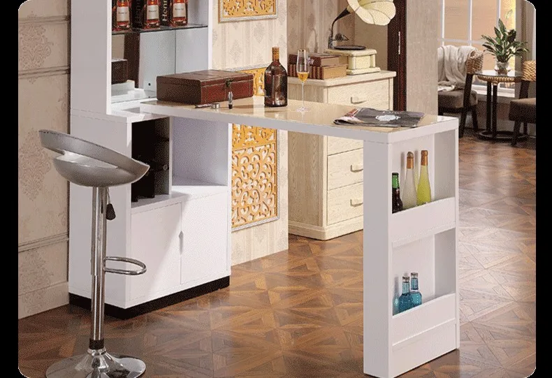 Как правило, такие модели барной стойки закрыты с одной стороны (обращенной в сторону гостиной) и не раскрывают всех своих секретов. А вот обратная сторона становится настоящей лавкой сокровищ! Здесь можно расположить и посуду, и бытовые мелочи, плетеные корзинки с фруктами, бутылки с дорогим вином.