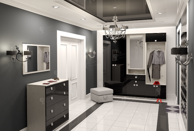 - Глянцевая. Блестящие прихожие – сочетание элегантности и тонкого вкуса. При оформлении помещения лучше сделать пор на что-то одно: подобрать в коридор глянцевую мебель, потолок или напольное покрытие. Так интерьер сохранит свою легкость и не будет казаться перегруженным. Глянцевые поверхности легки в уходе, эстетичны. Однако и им присущи некоторые недостатки. Так, на блестящей поверхности остаются следы от разводов и рук, брызг воды, поэтому за ней потребуется особенный уход.