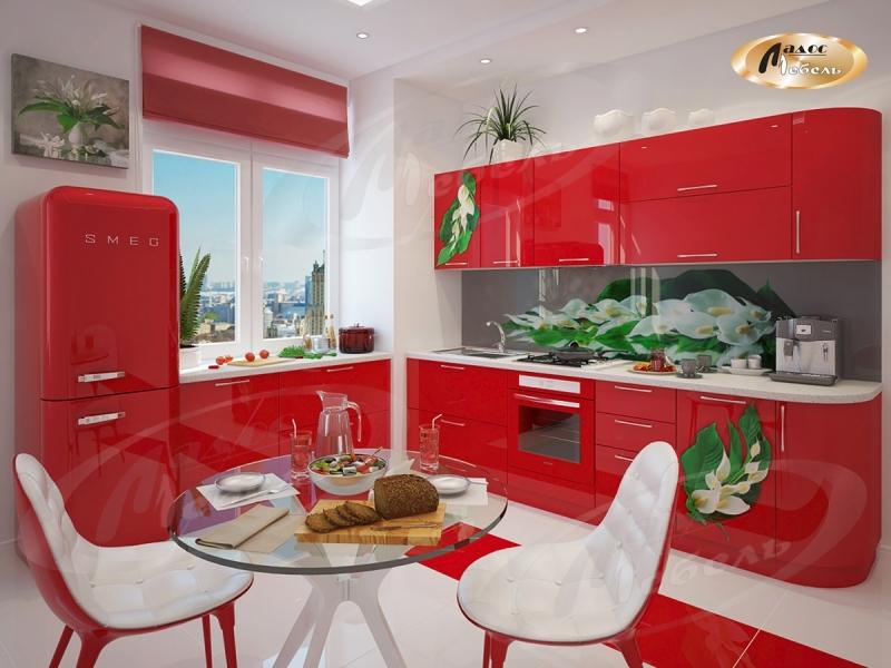 Изображение можно нанести на фасады верхних шкафчиков, комбинируя их с матовым стеклом. Картинку выбирайте такую, чтобы она слегка приглушала яркость красного.