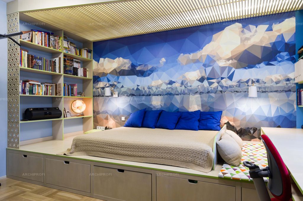 Стильное решение с использованием фотообоев в нейтральных тонах. Неординарный прием оформления подростковой комнаты в мансардном пространстве. Прием обыгрывания конструктивных особенностей планировки с акцентированием стеллажа и выступа в спальной зоне.