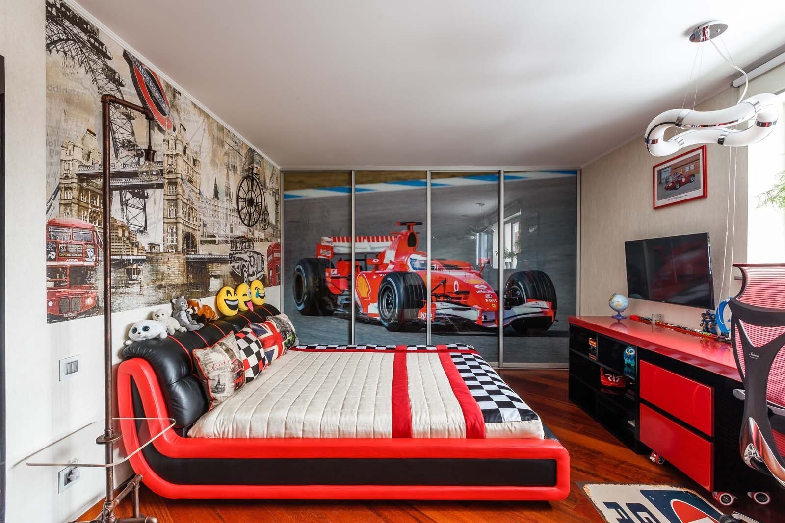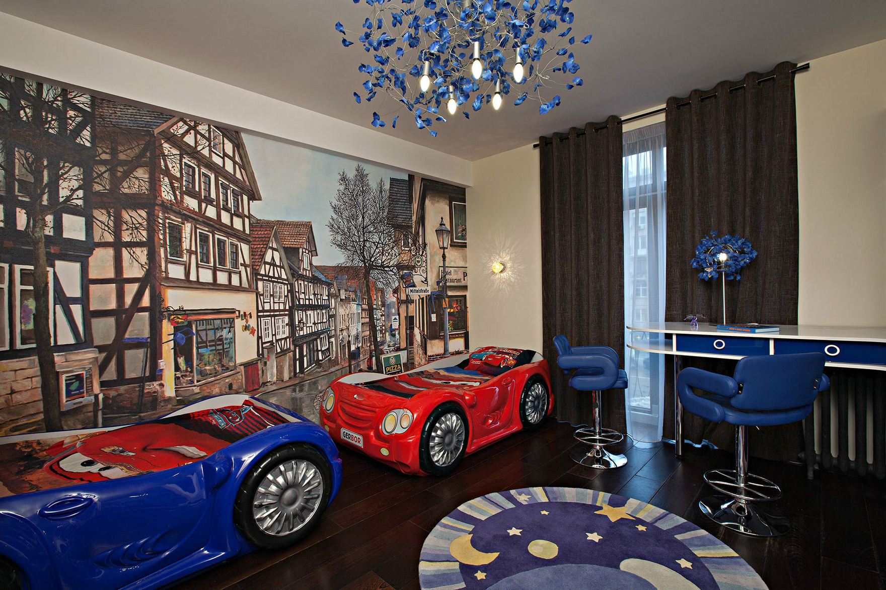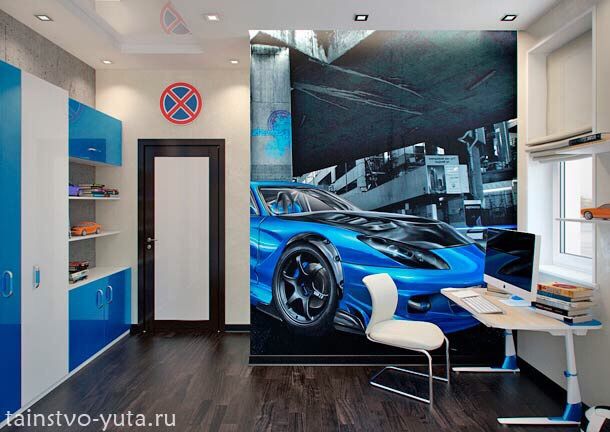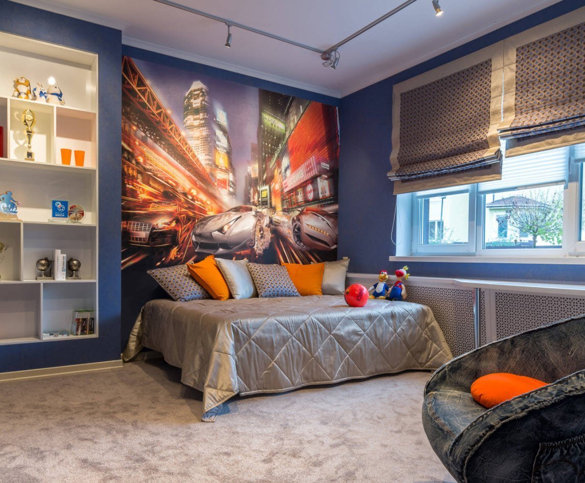 Безусловно, детские обои с традиционным повторяющимся принтом в виде машинок или игрушек для дизайна комнаты парней не подходят. Нежелательны и разнообразные герои мультфильмов, не соответствующие возрасту ребенка. Перед тем как отправляться в магазин за настенной облицовкой, стоит поинтересоваться мнением и увлечениями ребенка. Лучшим выбором для мальчиков 12-14 лет будут гоночные автомобили, трехмерные полотна с изображением футбольного поля, а также морская тематика, выполненная на фотообоях.