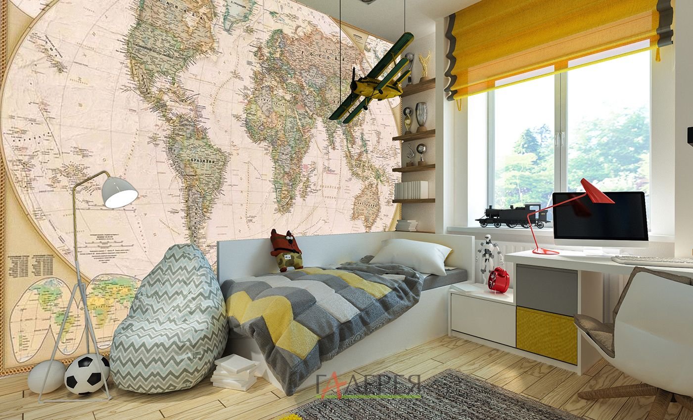 Тем, кому нравятся объемные картины, стоит обратить внимание на полотна с изображением ночного либо дневного города. Смотрятся такие фотообои не просто стильно: они зрительно наполняют комнату воздухом и простором. Не менее хороши для стен подростковой комнаты и варианты с изображением карты мира.