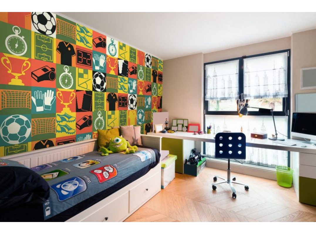 Это заметно по прорисовке элементов либо их приближенности к реальности. Изображения могут быть не только рисованными и схематичными: нередко для детей постарше покупают или заказывают фотообои с изображениями кумиров футбола либо музыкальной индустрии. И если мальчикам 10-12 лет еще можно купить полотнища со стилизованными элементами комиксов, то для возрастной категории от 13 и 14 лет уже стараются купить обои-постеры.
