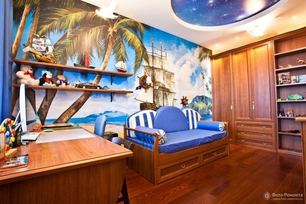 С чем можно сочетать обои с морской тематикойВ последнее время все большую популярность приобретает дизайн детской в морском стиле.Ведь кто из нас не мечтал почувствовать себя молодым капитаном огромного фрегата или храбрым пиратом.