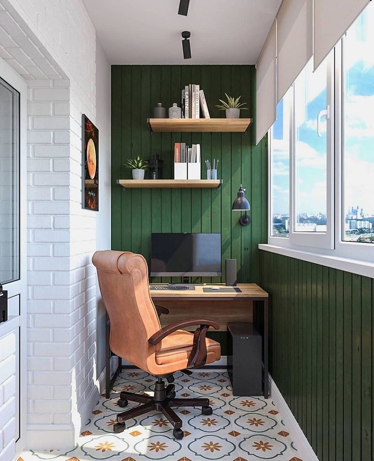 Даже на самом маленьком балконе можно сделать шикарный кабинет. Много мебели здесь не понадобиться — комфортное кресло или стул, рабочий стол и небольшие полки для оргтехники и хранения документации.