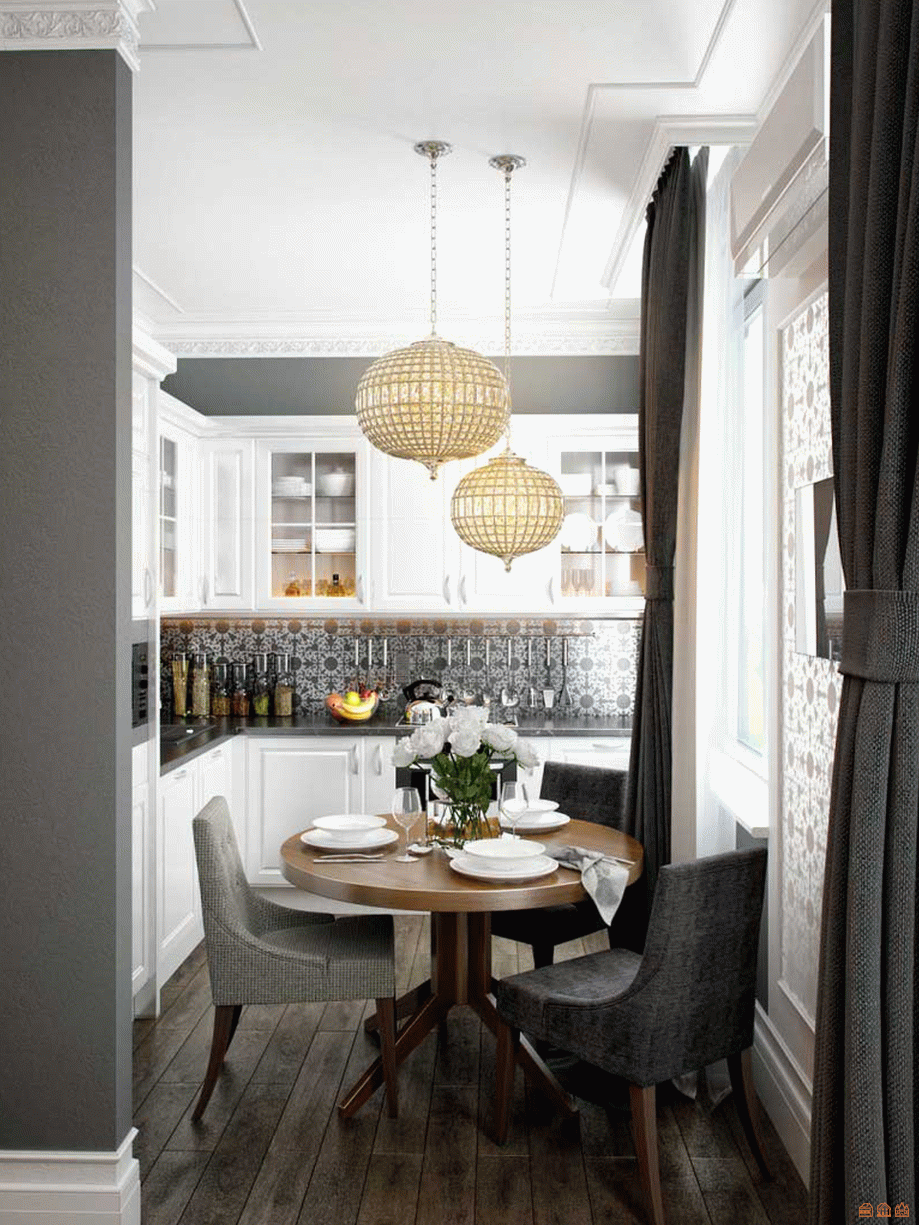 Главное, не перегрузить интерьер. Например, стоит отказаться от вычурных картин, тяжелой деревянной мебели. Возьмите от классического стиля правильность пропорций и гармонию цветовых сочетаний, тогда даже кухня в хрущевке будет выглядеть элегантно.