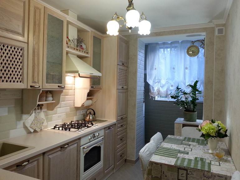 Планировка подобного кухонного помещения, как правило, имеет прямоугольную форму с балконом в торцевой части.