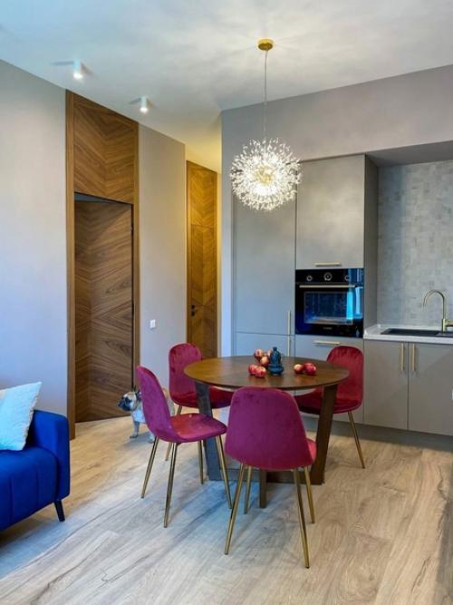 Для сохранения простора кухня-гостиная и весь остальной дизайн квартиры выполнен в светлых тонах: окрашенные в светло-серый цвет стены мягко сочетаются с древесными оттенками на полу — вместе с потолочной люстрой и бра они создают уютную и теплую атмосферу, в которой утопает вся комната. Акцентом в кухне выступает отделка фартука плиткой с объемным геометрическим принтом. В гостиной, как и присуще фьюжн-интерьерам, с нейтральным монохромом контрастируют живые растения, картины с яркими красками и матовый текстиль.