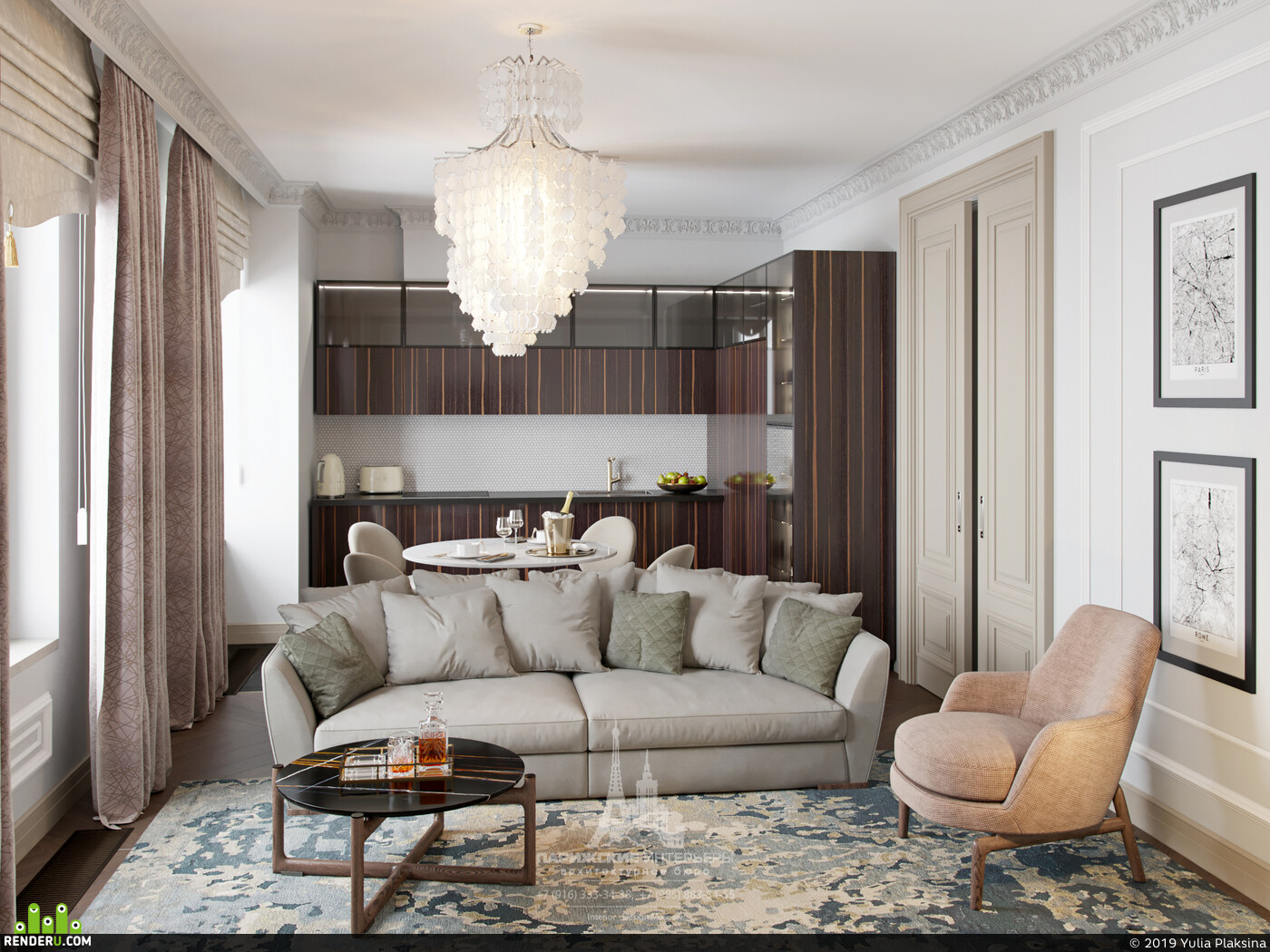 Потолок в комнате, выполненной в неоклассике, как правило, оформляют массивной люстрой. Такой акцент сделает помещение благороднее. Кстати, это одна из ведущих фишек в неоклассическом стиле.