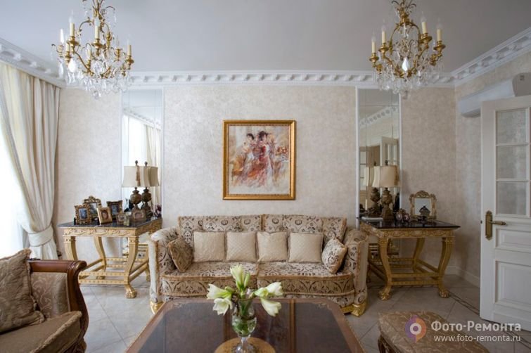 - Стены оформлены в светлых и золотистых тонах, украшены зеркалами и картинами;