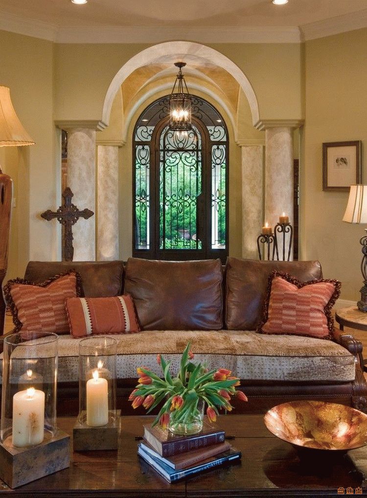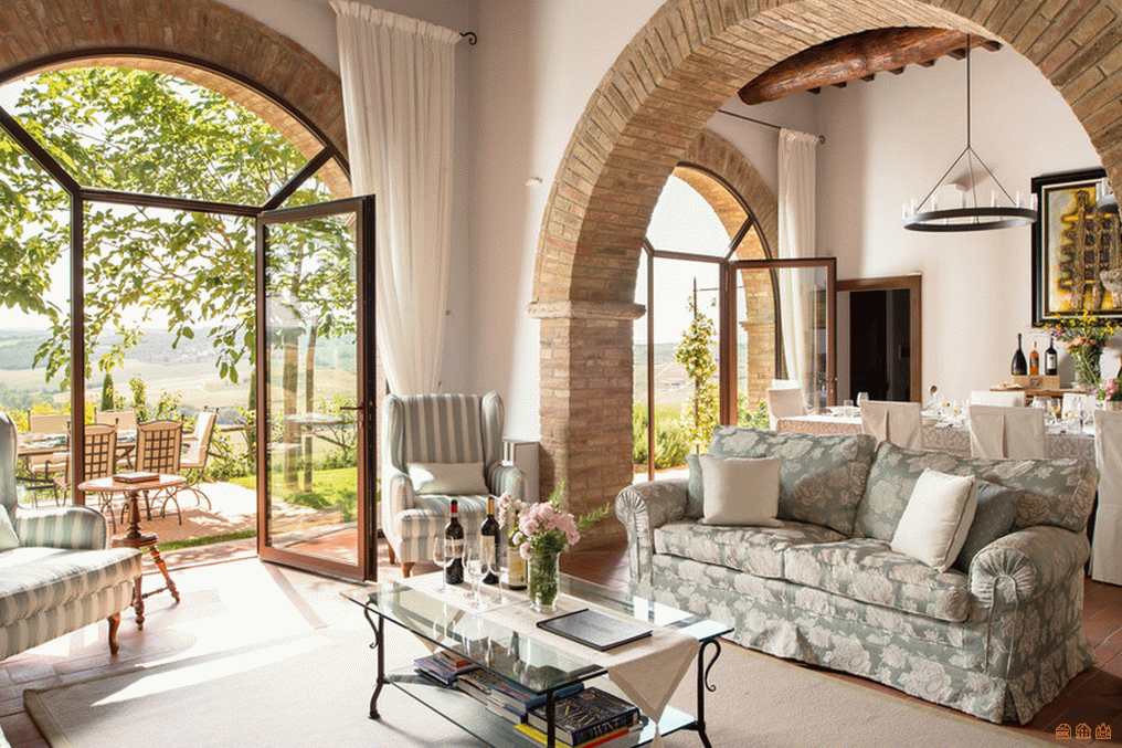Проемы в виде арок, высокие потолки, фрески — характерно для средиземноморского направления.