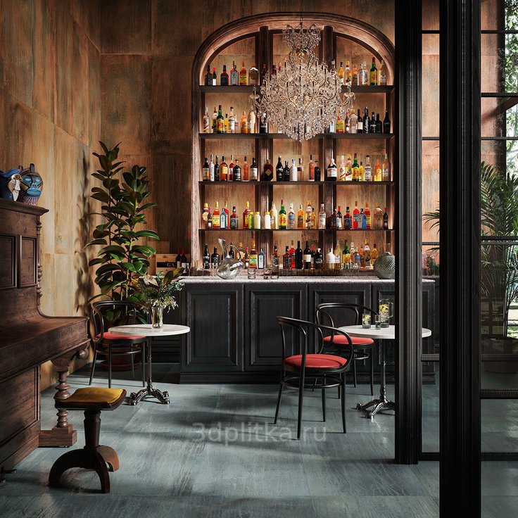 Большие окна, камин, тяжелая добротная мебель, кованая люстра, обилие антикварных вещиц, мелких деталей и аксессуаров, каждый из которых имеет свою историю и смысл. Стены оформлены фресками со средиземноморскими сюжетами и венецианской штукатуркой. Массивные колонны, арки и потолок украшены ажурным кружевом лепнины. Здесь приветствуется зонирование пространства и панорамное остекление.