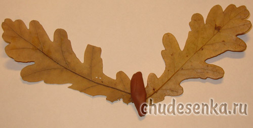 4. Создайте крылья из дубовых листьев — Найдите четыре одинаковых больших дубовых листа, чтобы использовать их для крыльев. Приклейте по два листа в шахматном порядке к каждой области крыла.